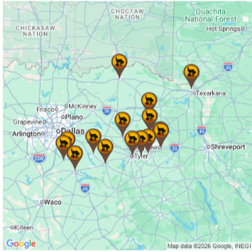 A wooded, slower-paced BBQ trail with a mix of well-known stops and local favorites across Northeast Texas.